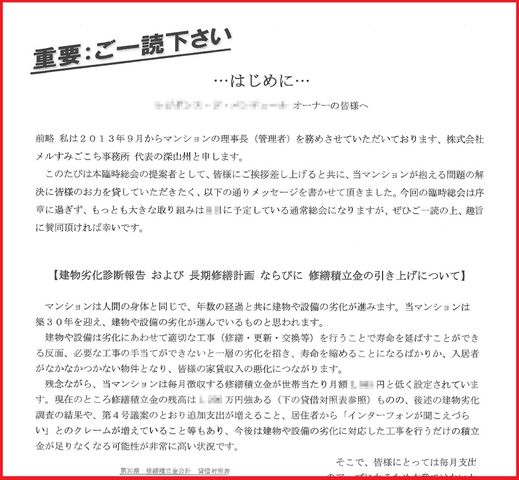 総会議案書を全オーナーへ配布するタイミングで、現状の建物劣化や財政状況をお伝えし、今後は修繕積立金を引き上げたり、上述のような収入を増やす(管理費会計の無駄を減らす)必要があることを、理事長代行としての熱いメッセージを添えて総会議案書へ添付しています。