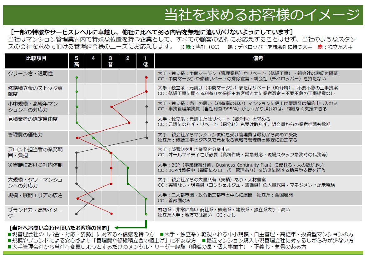 広範囲をカバーでき実績やブランドある大手管理会社や、価格勝負(修繕工事で利益誘導して元を取っているだけだが)の独立系管理会社には敵わない部分は勝負しない。